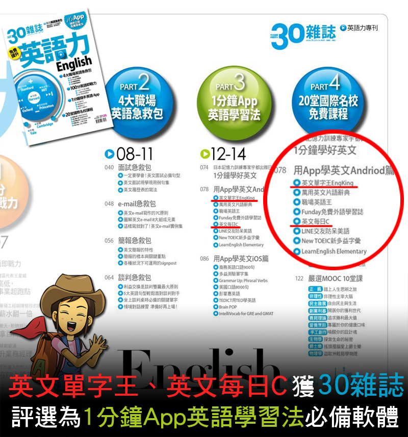 英文單字王、英文每日C獲得30雜誌特刊推薦為學英文必備App,讓你1分鐘免費App學習,養成隨讀的好習慣!