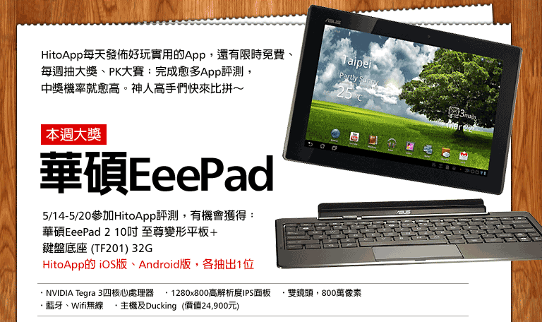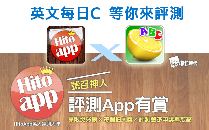 在此號召各位粉絲踴躍參加並幫我們打分數!還可抽熱門3C大獎!大家快去下載HitoApp,參加評測試手氣~最後別忘了幫英文每日C評分五顆星唷!