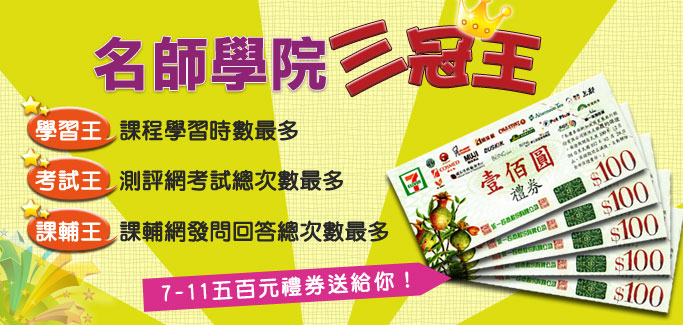 名師學院智慧學習系統完整結合學習、測評和課輔,為鼓勵學員們多學習、進行測驗和踴躍發問及回答,特推出一年一度的「名師學院三冠王」獎學金活動(每年6月30日為止,名師學院系統將自動統計從前一年7月1日到當年6月30日為止,學員們的課程學習總時數、測評考試總次數和輔導發問回答總次數。),只要是達到獎勵標準的同學,就能獲得7-11五百元禮券和獎狀乙張。