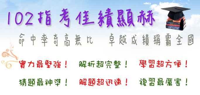 102指考命中率比對上線囉!精采的名師學院教材與題目命中率比對,都在以下各科檔案中,同學們請點選檔案標題連結,見證名師學院升大系列產品再度交出的亮眼成績單!