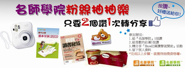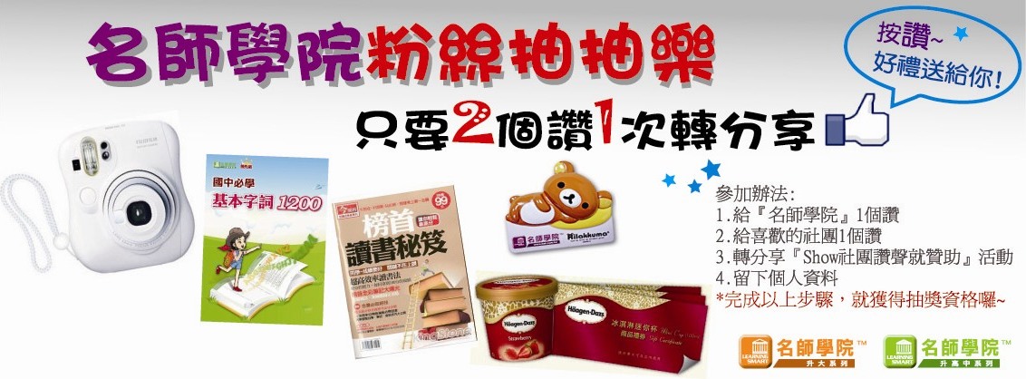 即日起至6/30止,於『名師學院粉絲團』按讚+分享即可參加抽抽樂~