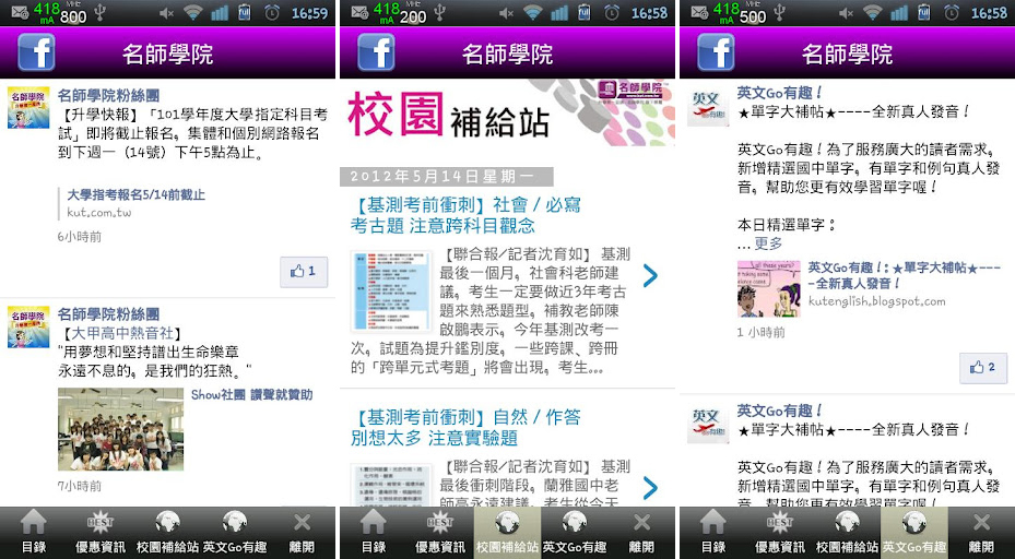 3.學習不再是一個人,讀樂樂不如一起眾樂樂,Android「名師學院」帶領你前往各大主題粉絲團,包括名師學院最新消息,升學動態、校園娛樂、英文學習、好康活動等各類資訊,讓大家可以與親朋好友一同分享學習經驗。