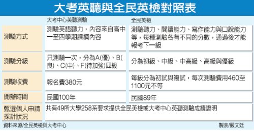 過去大學甄選入學個人申請備審資料,要求報名考生必須提供「全民英檢成績」當備審資料,去年加入大考英聽後,今年各大學備審資料也改為「全民英檢與大考英聽測驗成績均可」,根據簡章,已有49所大學258系都有類似要求。