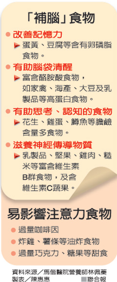 馬偕醫院營養師林佩蓁說,大腦神經系統由脂質組成,卵磷脂是重要脂質之一,考生可每天攝取黃豆相關製品或雞蛋。另外,鐵質不足將不利記憶。林佩蓁說,考生可以吃蛋黃或紅肉補充鐵質。