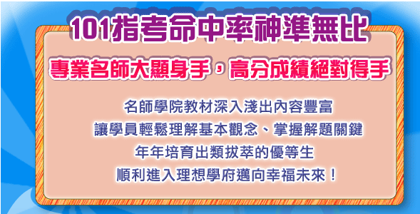 101指考命中率比對上線囉!精采的名師學院教材與題目命中率比對,都在以下各科檔案中,同學們請點選檔案標題連結,見證名師學院升大系列產品再度交出的亮眼成績單!前往觀看