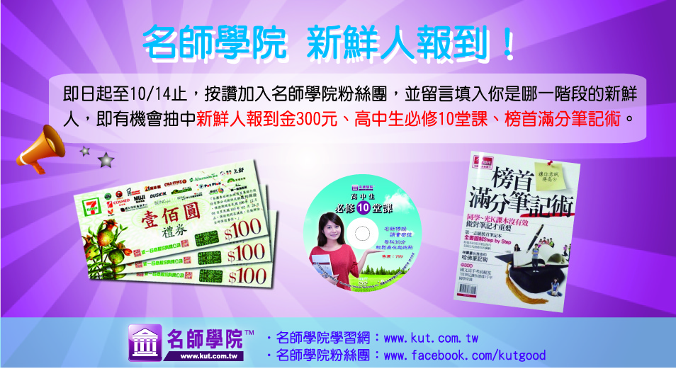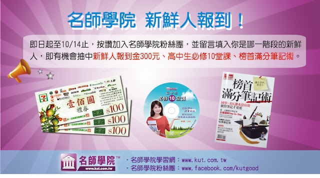 即日起至10/14按讚加入名師學院粉絲團,並留言填入你是哪一階段的新鮮人(小一、國一、高一、社會) 即有機會抽中「新鮮人報到金300元、榜首滿分筆記術、高中生必修10堂課」。這樣的好康哪裡找?動作快快快!前往活動網頁