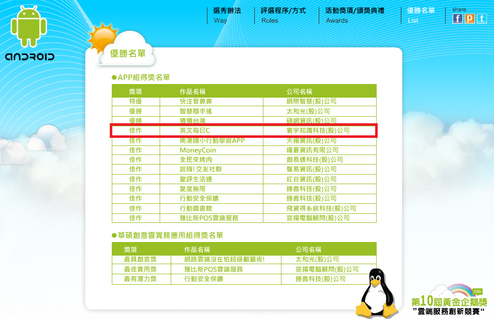 繼「英文單字王」在2011年獲得台北市電腦公會主辦的第九屆黃金企鵝獎最佳人氣獎之後,寰宇名師學院旗下APP應用軟體「英文每日C」2012年再度以最佳實力勇奪第十屆黃金企鵝獎佳作,好產品禁得起考驗,寰宇名師學院研發實力再度獲得官方肯定!